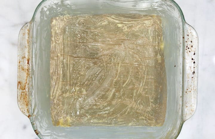 - Preheat the oven to 325°F. Grease an 8-inch square glass baking dish with butter. Be generous when greasing to ensure the cake releases easily from the pan. You can also line the bottom with a square of parchment paper and then grease the paper.1 tablespoon unsalted butter