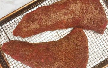 When carving the meat, slice it against the grain. Since the meat fibers in tri-tip run in two different directions, you'll need to cut each roast in half at the center point and then slice each half across the grain.